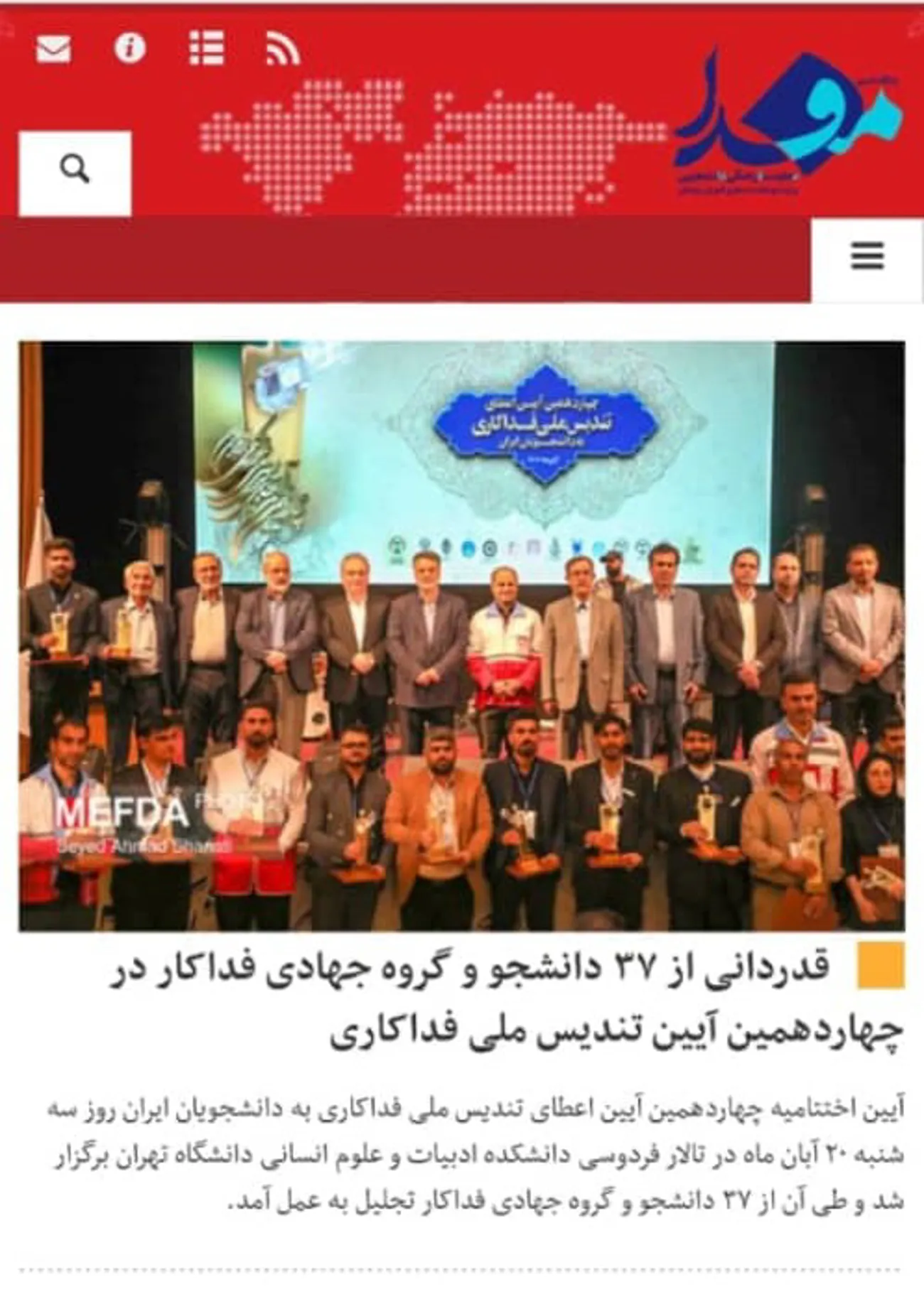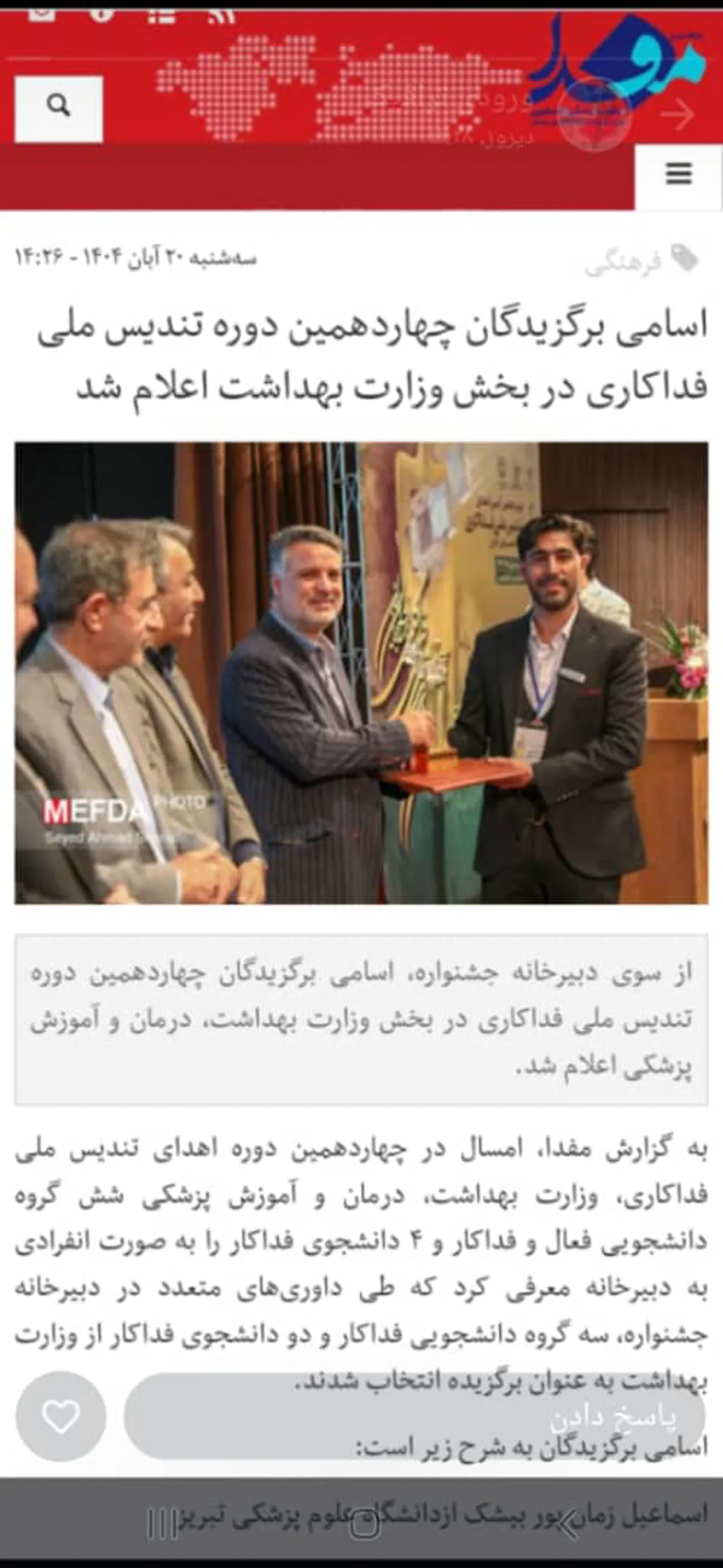 اسماعیل زمانپور بیشک، دانشجوی کارشناسی ارشد سلامت و ترافیک دانشگاه علوم پزشکی تبریز (دانشجوی فداکار)در بین ۳۷ دانشجو و گروه جهادی برتر در چهاردهمین آیین تندیس ملی فداکاری