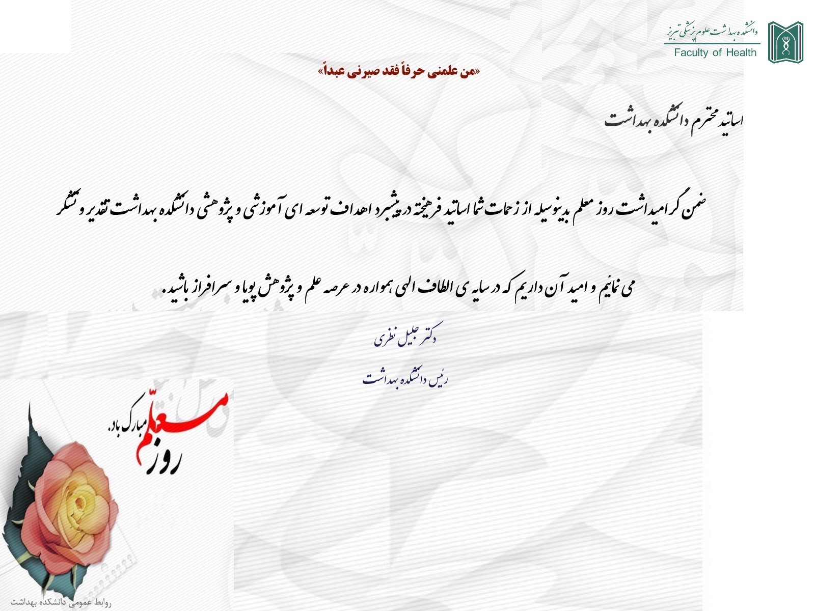 پیام تبریک روز معلم پیام تبریک رئیس دانشکده بهداشت به مناسبت روز معلم کد خبر : 46162 کپی کلمات کلیدی : دانشکده بهداشت تبریز روابط عمومی تبریک روز معلم اساتید دانشکده