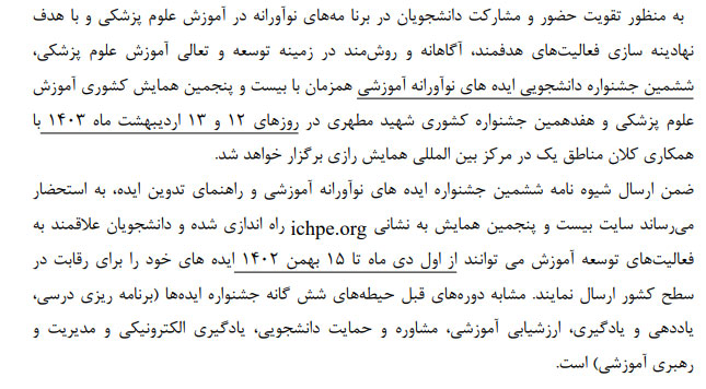 ششمین جشنواره دانشجویی ایده¬های نوآورانه آموزشی سال 1403 . شیوه نامه ششمین جشنواره دانشجویی ایده های نوآورانه آموزشی سال 1403 کد خبر : 46214 کپی کلمات کلیدی : جشنواره دانشجویی شیوه نامه ارزشیابی ایدههای نوآورانه