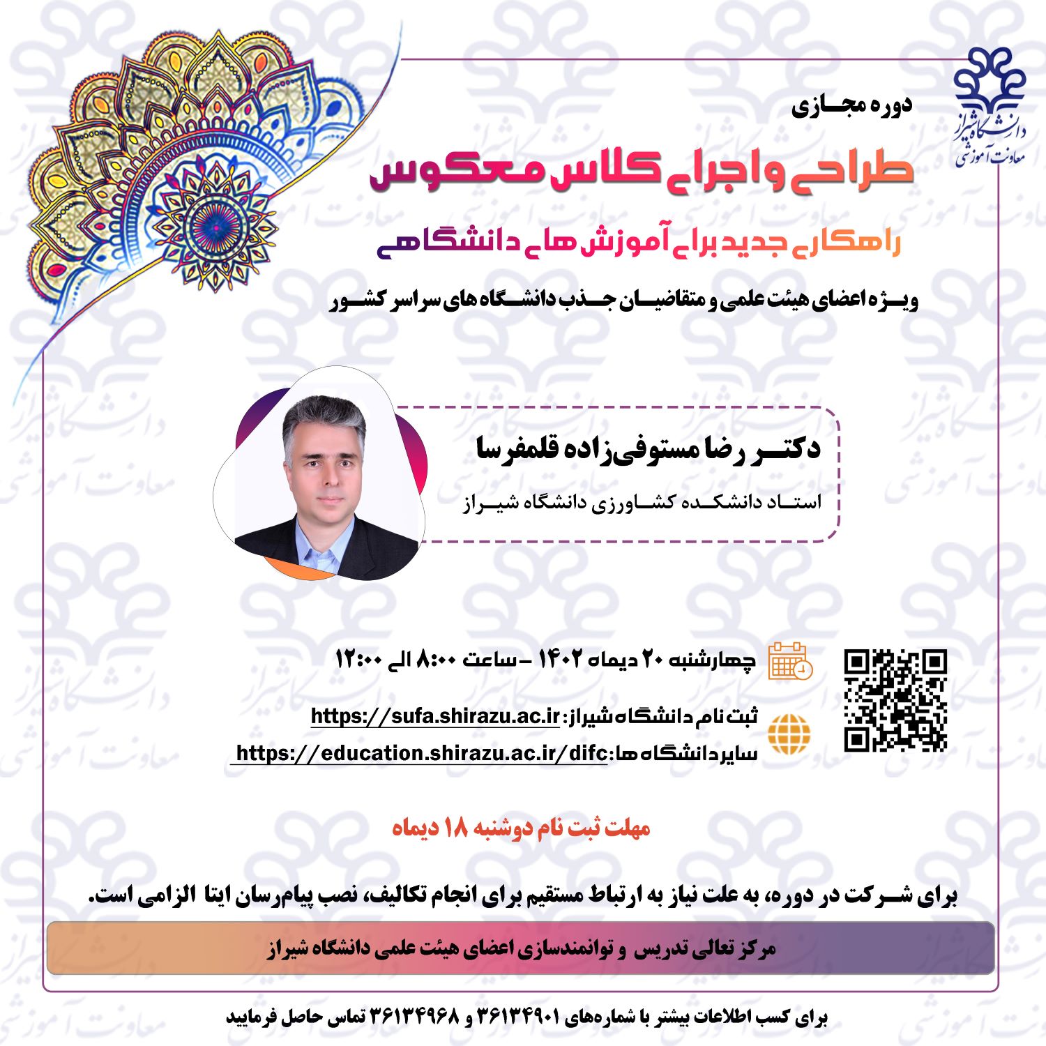 مرکز تعالی تدریس و توانمندسازی اعضای هیات علمی دانشگاه شیراز برگزار می کند:دوره مجازی" طراحی و اجرای کلاس معکوس، راهکاری جدید برای آموزشهای دانشگاهی" مدرس:دکتر رضا مستوفیزاده قلمفرسا (استاد دانشکده کشاورزی دانشگاه شیراز) زمان: چهارشنبه 20 دیماه 1402 از ساعت 8 صبح الی 12 لینک ثبت نام اساتید دانشگاه شیراز: لینک ثبت نام سایر دانشگاه ها: https://education.shirazu.ac.ir/difc |