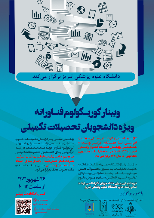 به گزارش روابط عمومی دانشگاه علوم پزشکی تبریز، مرکز توسعه و هماهنگی پژوهش دانشگاه علوم پزشکی تبریز (RDCC) با همکاری کارگروه کسب و کار دانش بنیان معاونت آموزشی و کمیته تحقیقات و فناوری دانشجویی، وبینار مجازی "کوریکولوم فناورانه ویژه دانشجویان تحصیلات تکمیلی" را روز دوشنبه 26 شهریورماه 1403 ساعت 10 الی 12در بستر اسکای روم برگزار می کند.