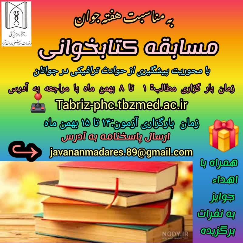 22 بهمن سال 1403 ،مصادف با 11 شعبان ،سالروز تولد حضرت علی اکبر (ع) و روز ملی جوان است به همین مناسبت ، فراخوان برگزاری مسابقه کتابخوانی با محوریت "پیشگیری از سوانح وحوادث در جوانان "برگزار می شودو کتاب پیشگیری از سوانح و حوادث در سایت https://Tabriz-_pbc.tbzmed.ac.ir بارگذاری شده است.